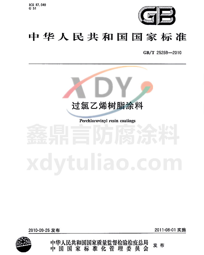 GB/T25259-2010過氯乙烯樹脂涂料標準ICS87.040 G51 GB 中華人民共和國國家標準 過氯乙烯樹脂涂料標準GB/T25259-2010Perchlorovinyl resin coatings 2010-09-26發(fā)布 2011-08-01實施 中華人民共和國國家質(zhì)量監(jiān)督檢驗檢疫總局 中國國家標準化管理委員會 發(fā)布 本標準規(guī)定了過氯乙烯樹脂涂料的分類、技術(shù)要求、試驗方法、檢驗規(guī)