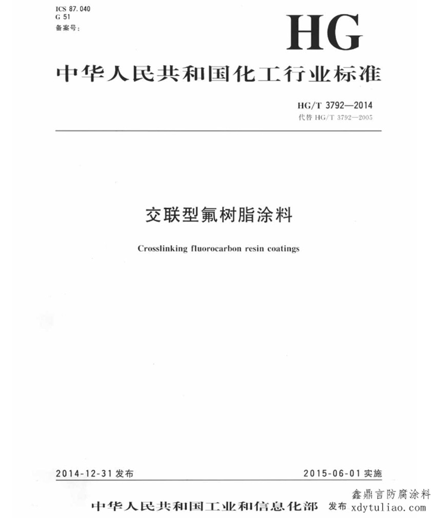 交聯(lián)型氟樹脂涂料標準HG/T 3792-2005是鑫鼎言氟碳漆按照紙質版HG/T 3792-2005《交聯(lián)型氟樹脂涂料》一個字一個字碼出來的,屬于原文照搬請放心參考。