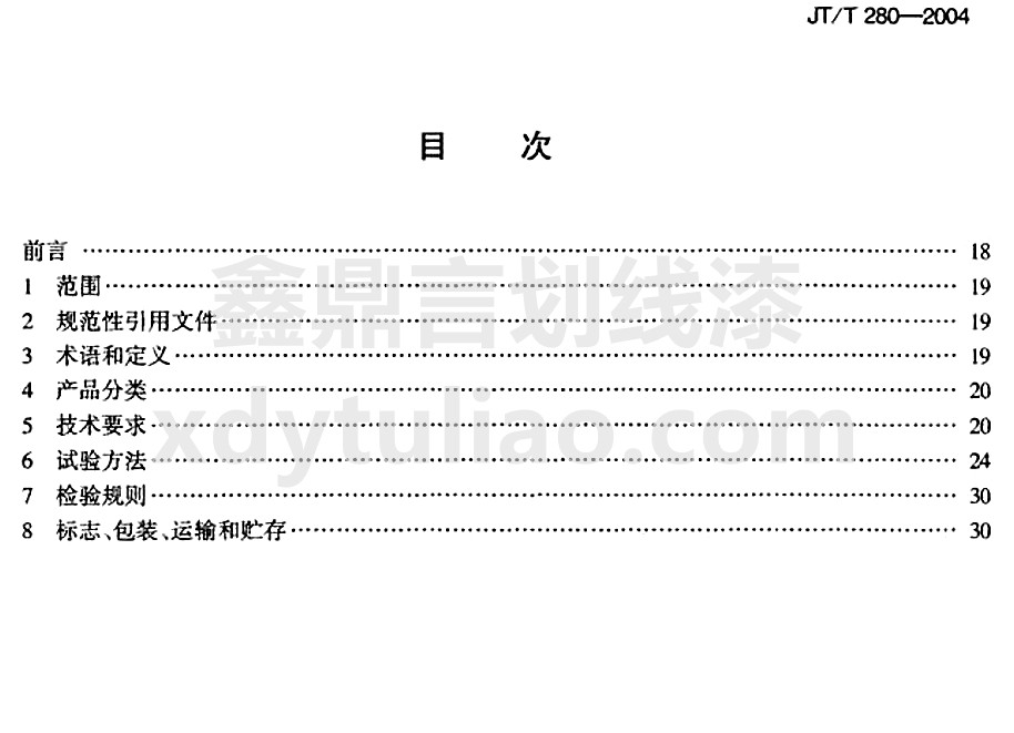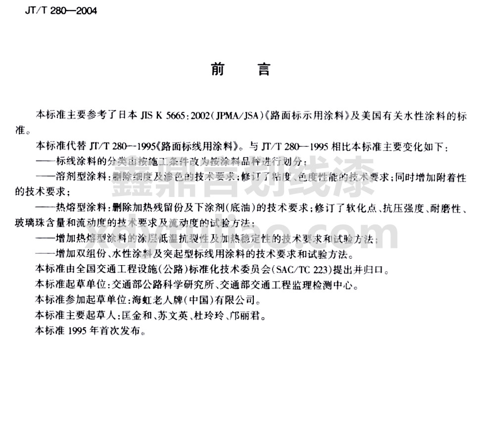 JT/T 280-2004路面標(biāo)線涂料標(biāo)準(zhǔn)是鑫鼎言防腐涂料小編照搬JT/T 280-2004《路面標(biāo)線涂料》紙質(zhì)版內(nèi)容,大家可以放心參考。更多防腐涂料執(zhí)行國家和行業(yè)標(biāo)準(zhǔn)等防腐涂料相關(guān)信息可以參與鑫鼎言防腐涂料網(wǎng)站:m.rsarkrs.com