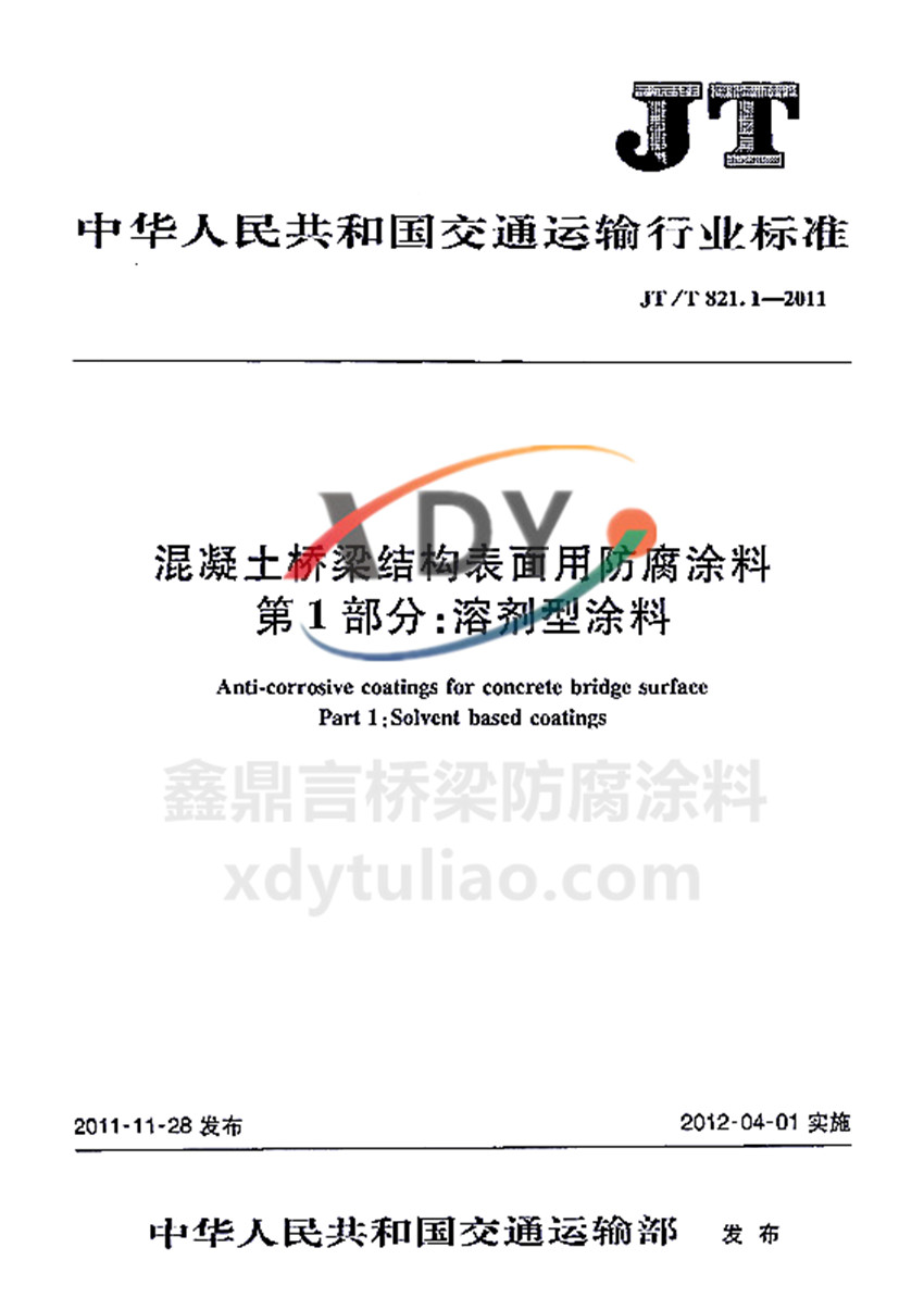 混凝土橋梁結構表面用防腐涂料 第1部分:溶劑型涂料JT/T821.1-2011 中華人民共和國交通運輸行業(yè)標準 JT/T821.1-2011 混凝土橋梁結構表面用防腐涂料 第1部分:溶劑型涂料 Anti-corrosive coatings for concrete bridge surface Part 1:Solvent based coatings 2011-11-28發(fā)布 2012-04-