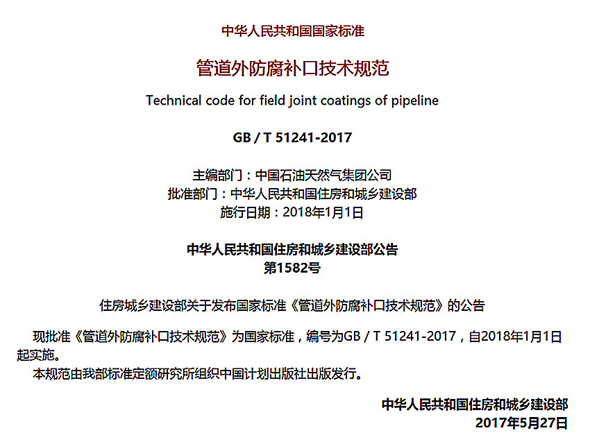 管道外防腐補口技術規(guī)范施工工藝標準GB/T 51241-2017
