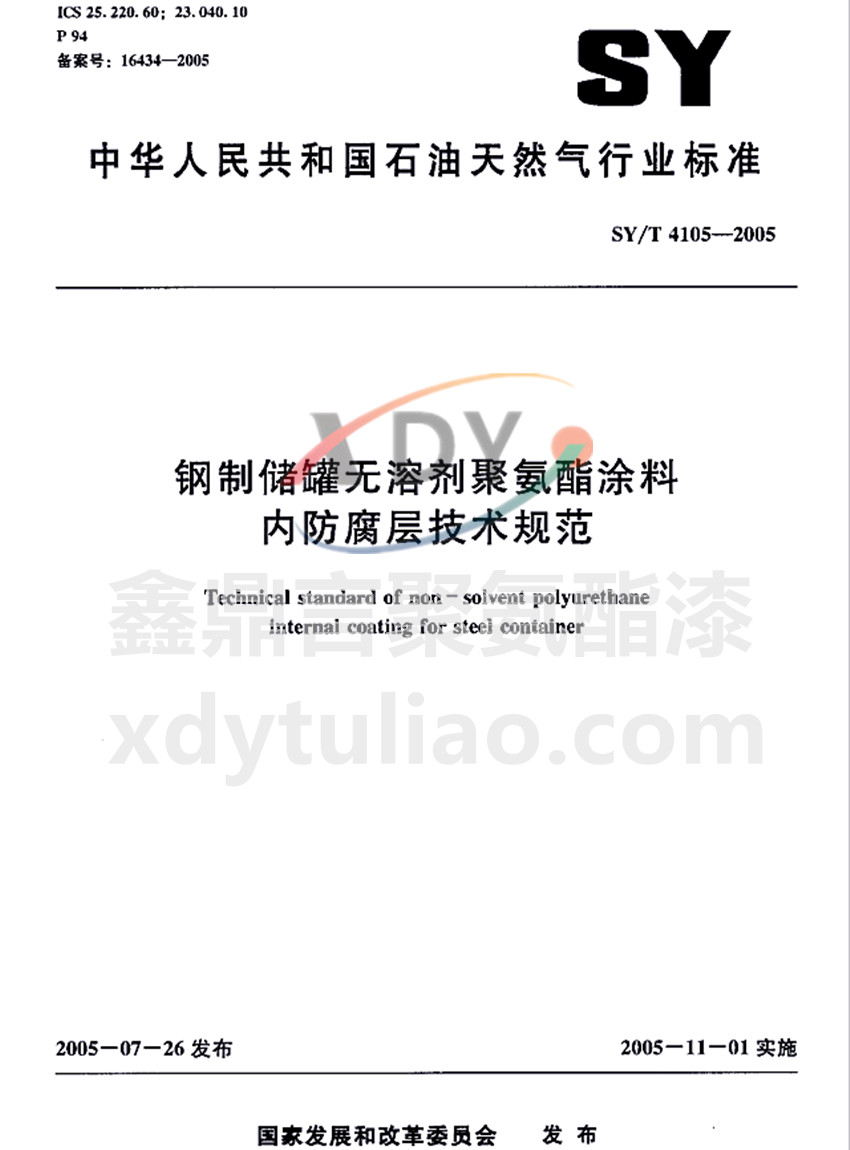 鋼制儲(chǔ)罐無(wú)溶劑聚氨酯涂料內(nèi)防腐層技術(shù)規(guī)范標(biāo)準(zhǔn)SY/T 4105-2005