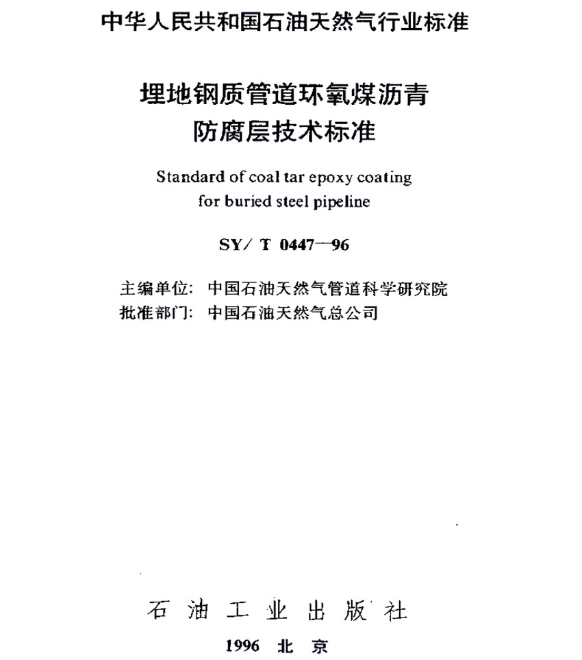 SY/T 0447-96埋地鋼質(zhì)管道環(huán)氧煤瀝青防腐層施工技術(shù)要求標(biāo)準(zhǔn)是鑫鼎言防腐涂料小編復(fù)制SY/T 0447-96《埋地鋼質(zhì)管道環(huán)氧煤瀝青防腐層技術(shù)》電子版,可以放心參考。更多防腐涂料防腐涂裝執(zhí)行的國(guó)家標(biāo)準(zhǔn)和行業(yè)標(biāo)準(zhǔn),可以查閱鑫鼎言防腐涂料網(wǎng)站。